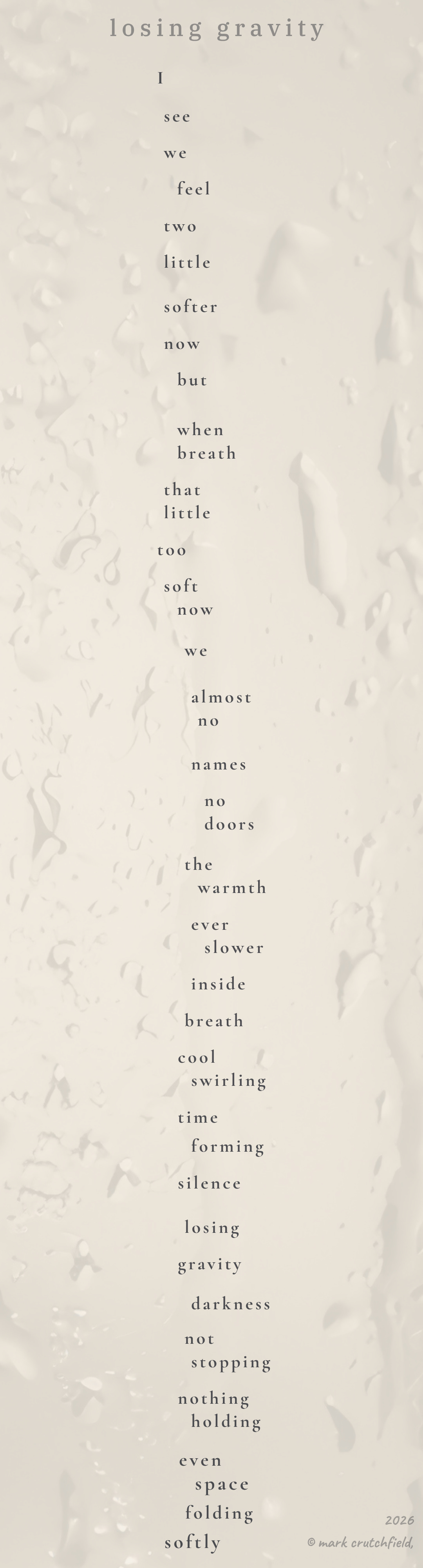 I see we feel two little softer now but when breath that little too soft now we almost no names no doors the warmth ever slower inside breath cool swirling time forming silence losing gravity darkness not stopping nothing holding even space folding softly